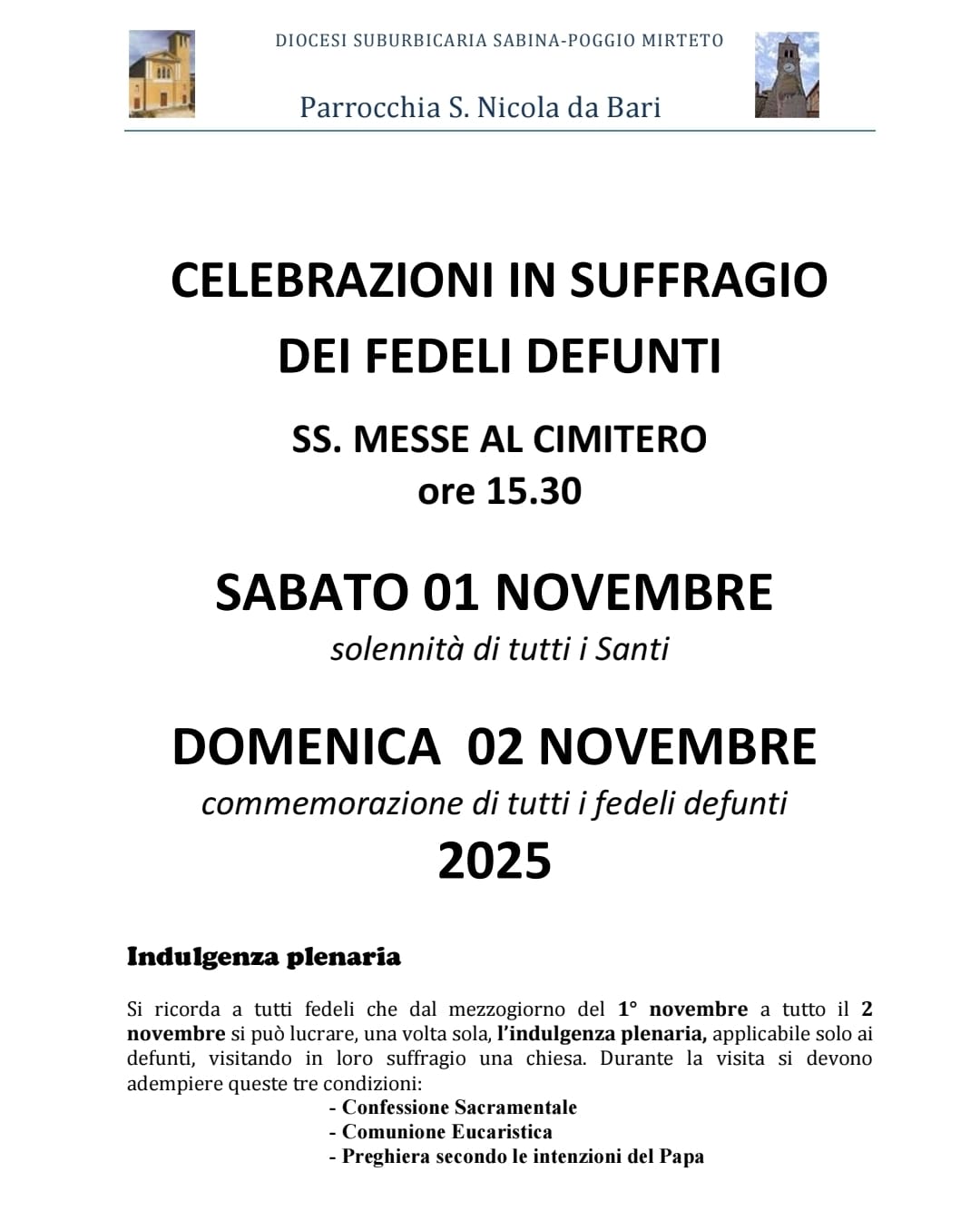 Si comunica che, come da locandina inserita di seguito, nei giorni 1 e 2 novembre 2025, si svolgeranno alle ore 15:30, presso la Chiesa del Cimitero di Mentana, le celebrazioni in suffragio dei fedeli defunti. In basso nella locandina, le indicazioni per lucrare l’indulgenza plenaria a vantaggio dei defunti.